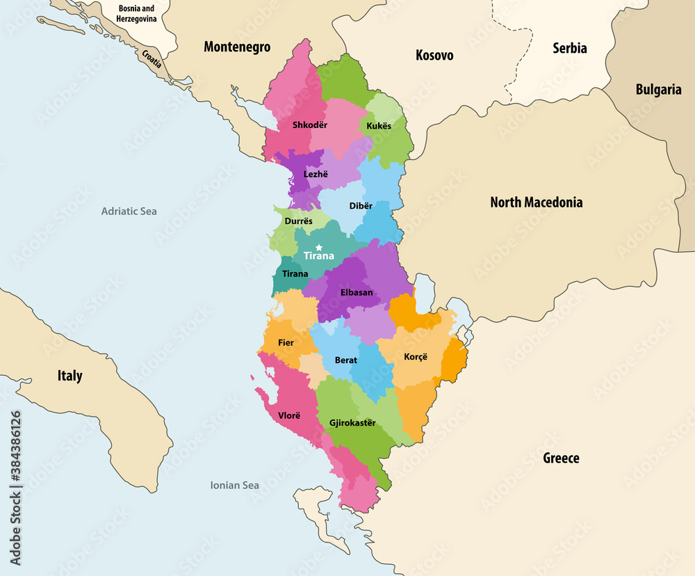 Foto Albania administrative divisions (distrcts) of colored by counties vector map wi