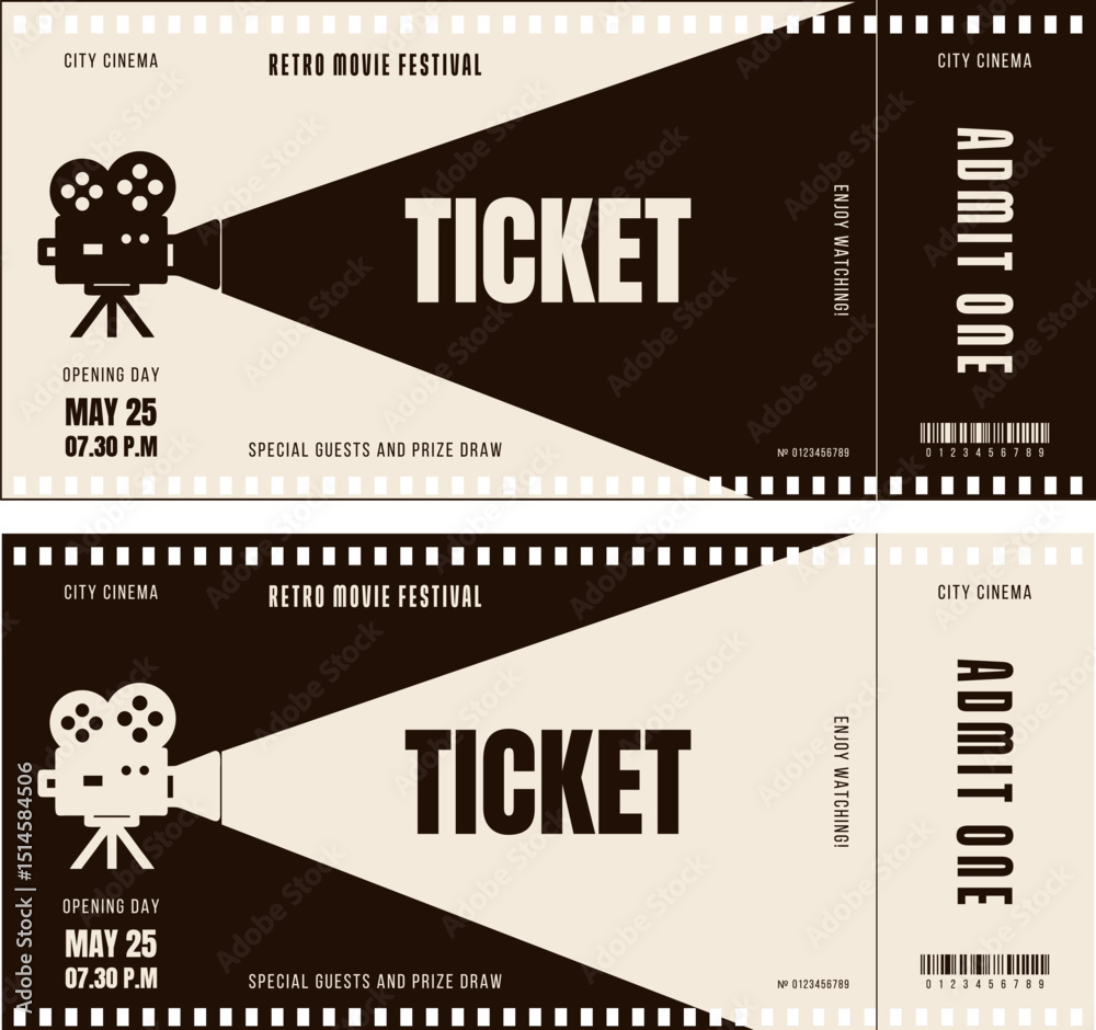 Tapet Retro movie ticket templates in contrasting light and dark themes, featuring vintage projector graphics and event details