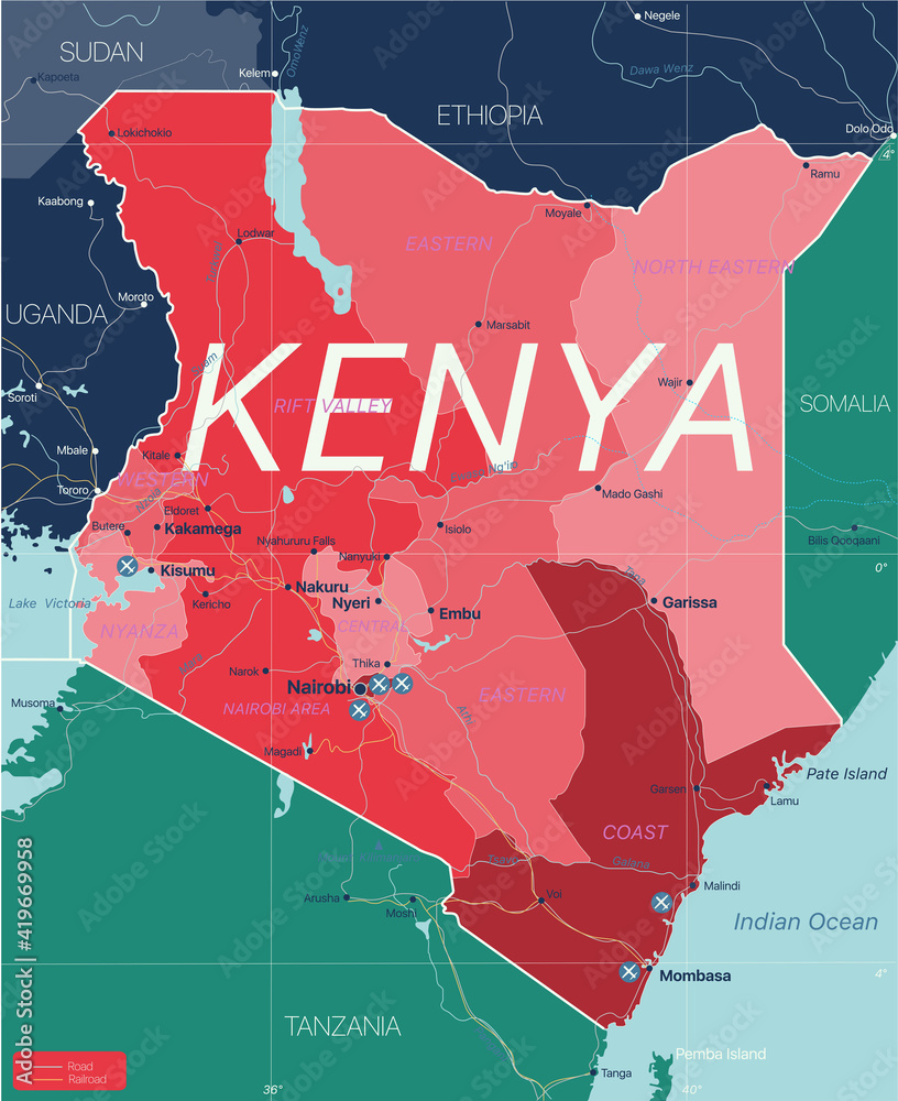 Bilde på lerret Kenya country detailed editable map with regions cities and towns, roads and railways, geographic sites