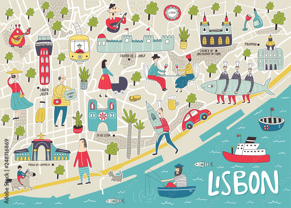 Klistremerke Illustrated Map of Lisbon with cute and fun hand drawn characters, local plants and elements