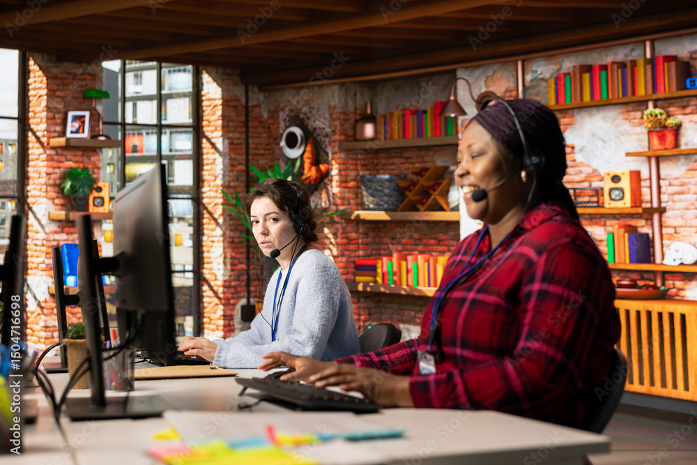 Bilde på lerret Call center agent laughing at funny joke while talking with customer in office