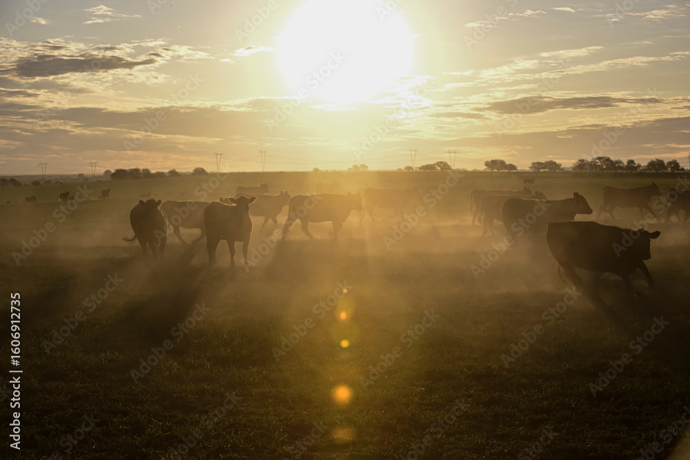 Bilde på lerret Cattle herd grazing in the field at sunset, in the Pampas plain, Patagonia, Arge