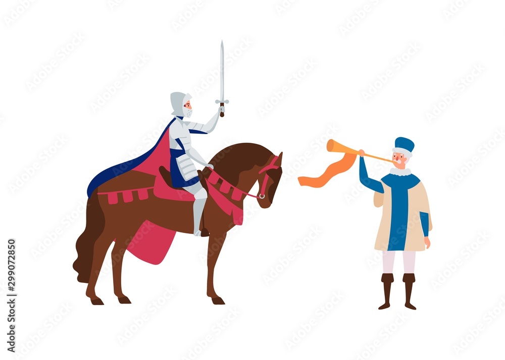 Bilde på lerret Royal herald with trumpet and knight on horse flat vector illustration