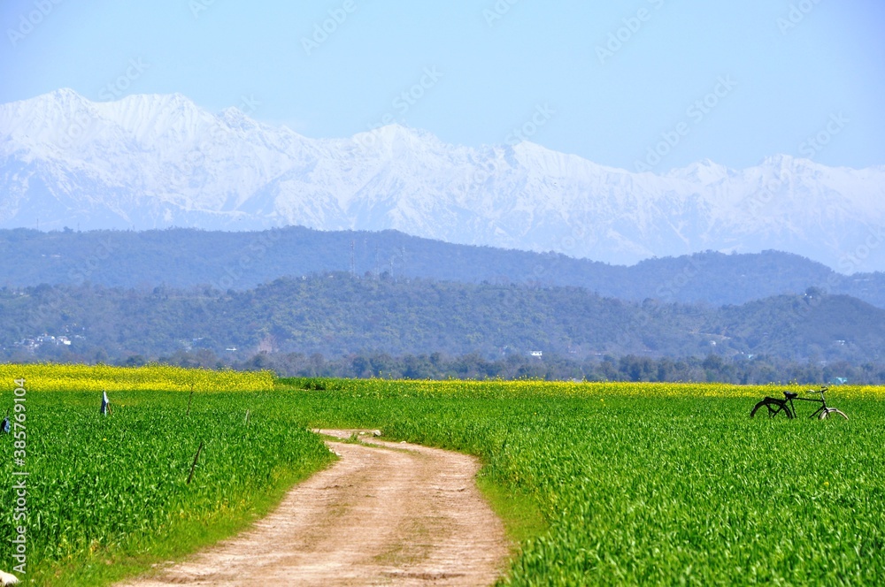 Bilde på lerret Mustard fields in full bloom against the backdrop of snow covered mountains in Kangra valley of Himachal Pradesh, India