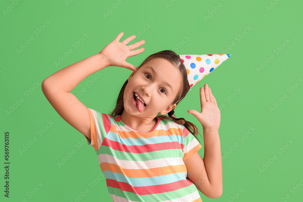 Bilde på lerret Funny little girl in party hat grimacing on green background