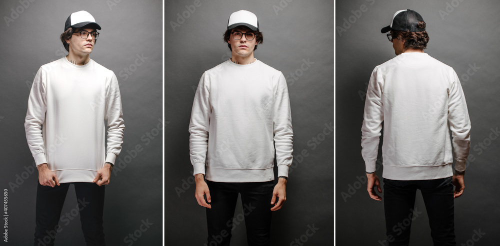 Foto Man wearing blank white sweatshirt and empty baseball cap standing over gray background