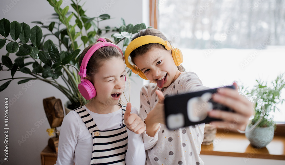 Foto Two small girls sisters with headphones indoors at home, grimacing when taking selfie
