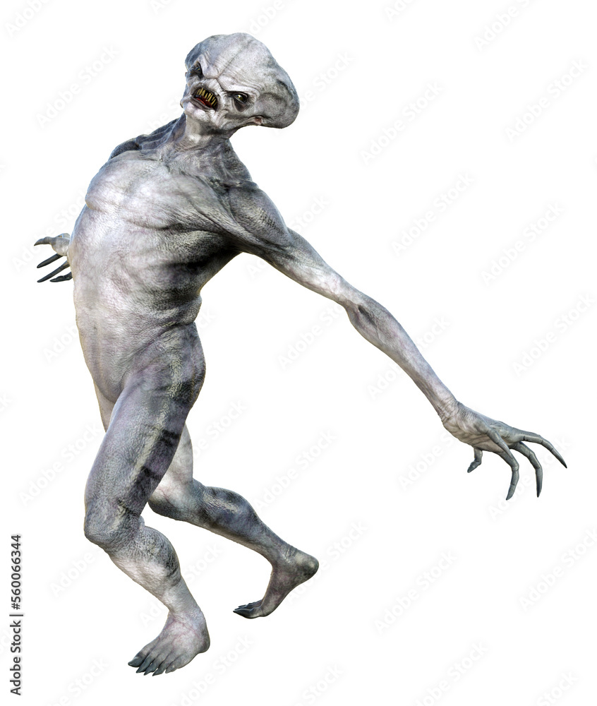 Foto Illustration of an alien grimacing with arms back and chest out isolated on a white background